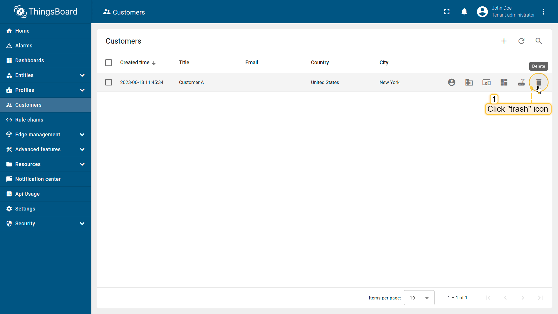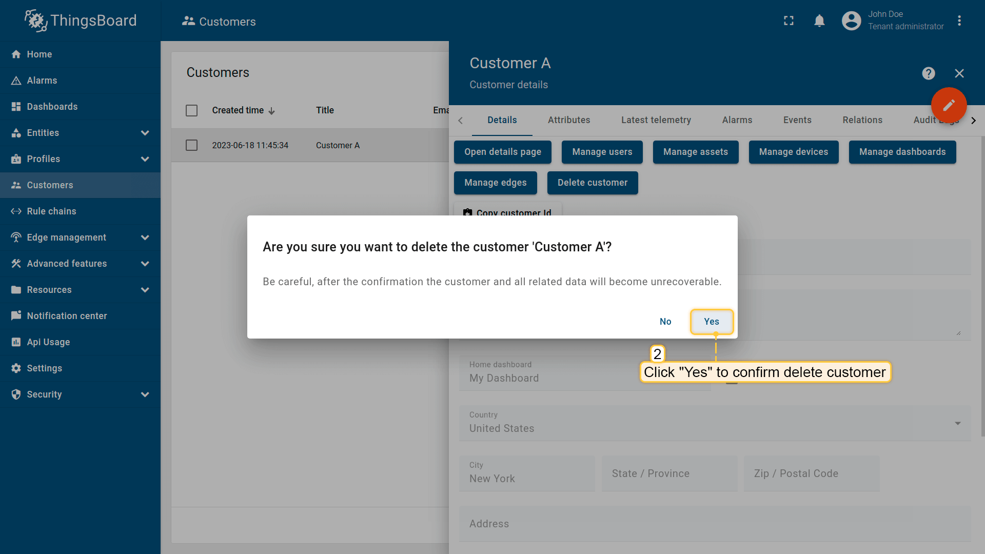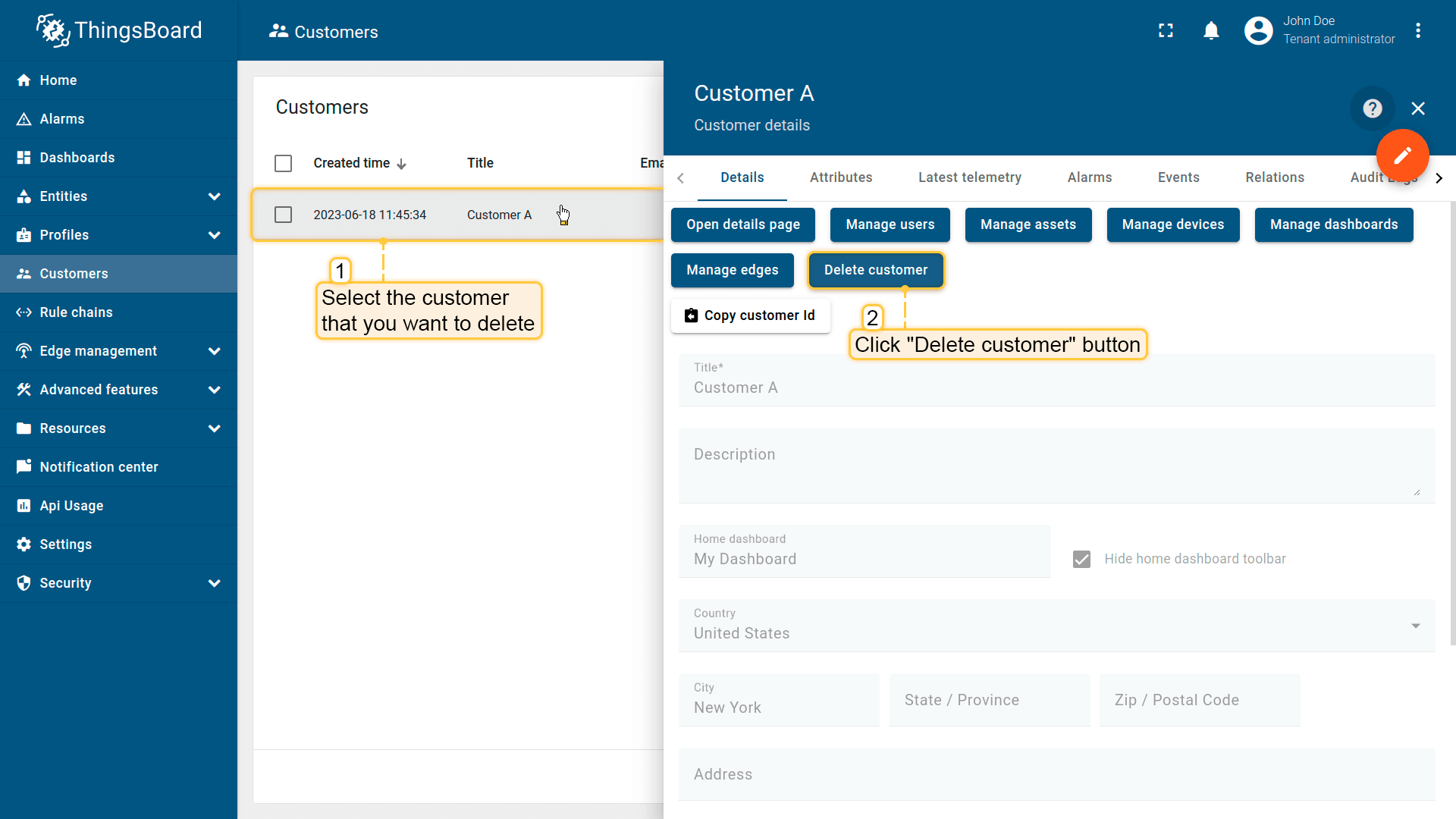 - 新客户创建成功。您可以直接在"客户"表中查看和管理该客户的用户与实体(设备、资产、仪表板等)。