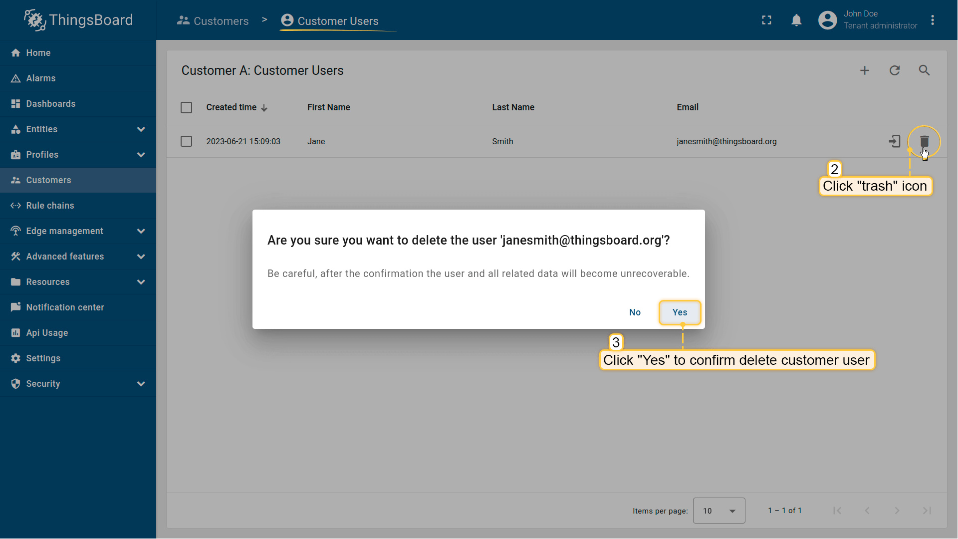 - 点击要删除的客户用户名称右侧的"垃圾桶"图标,并在对话框中确认删除。