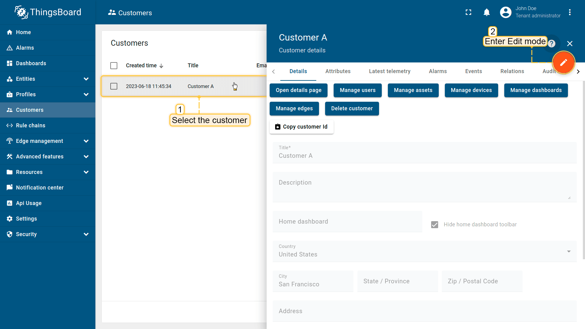 租户管理员可创建客户,并在客户详情页通过点击相关标签直接管理其资产、设备、仪表板和边缘。