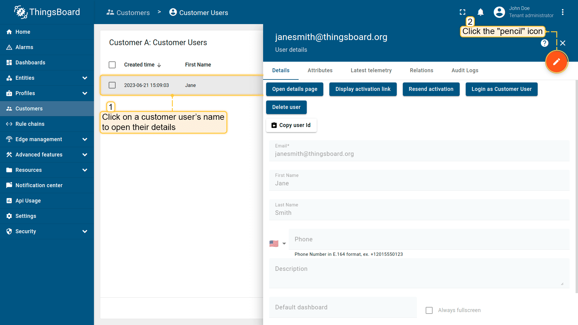 - 单击客户用户以打开他们的详细信息。单击"铅笔"图标以进入编辑模式。