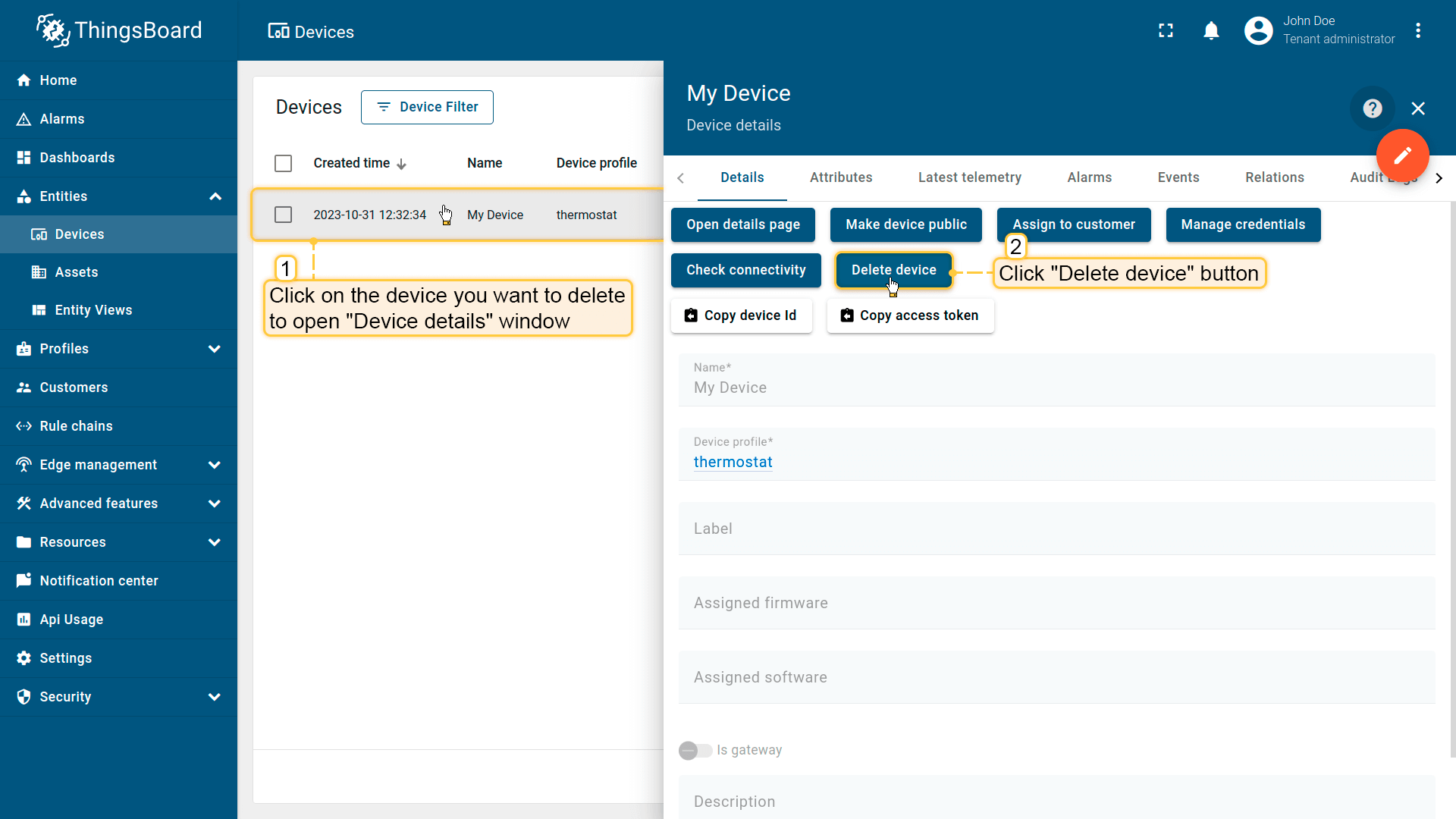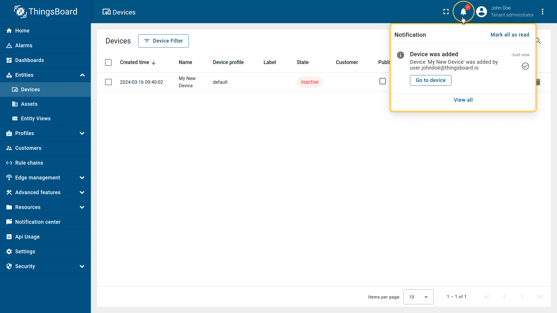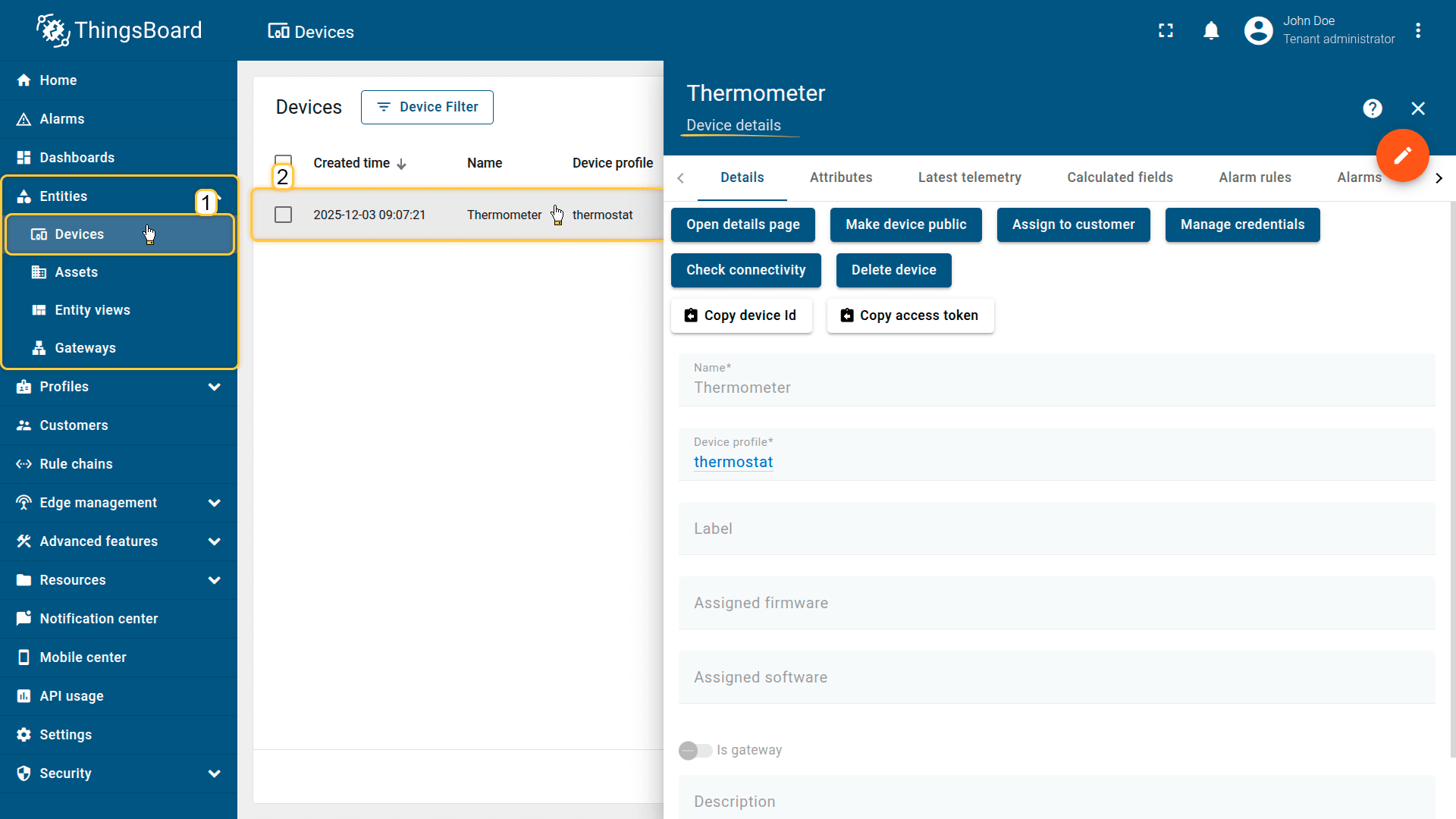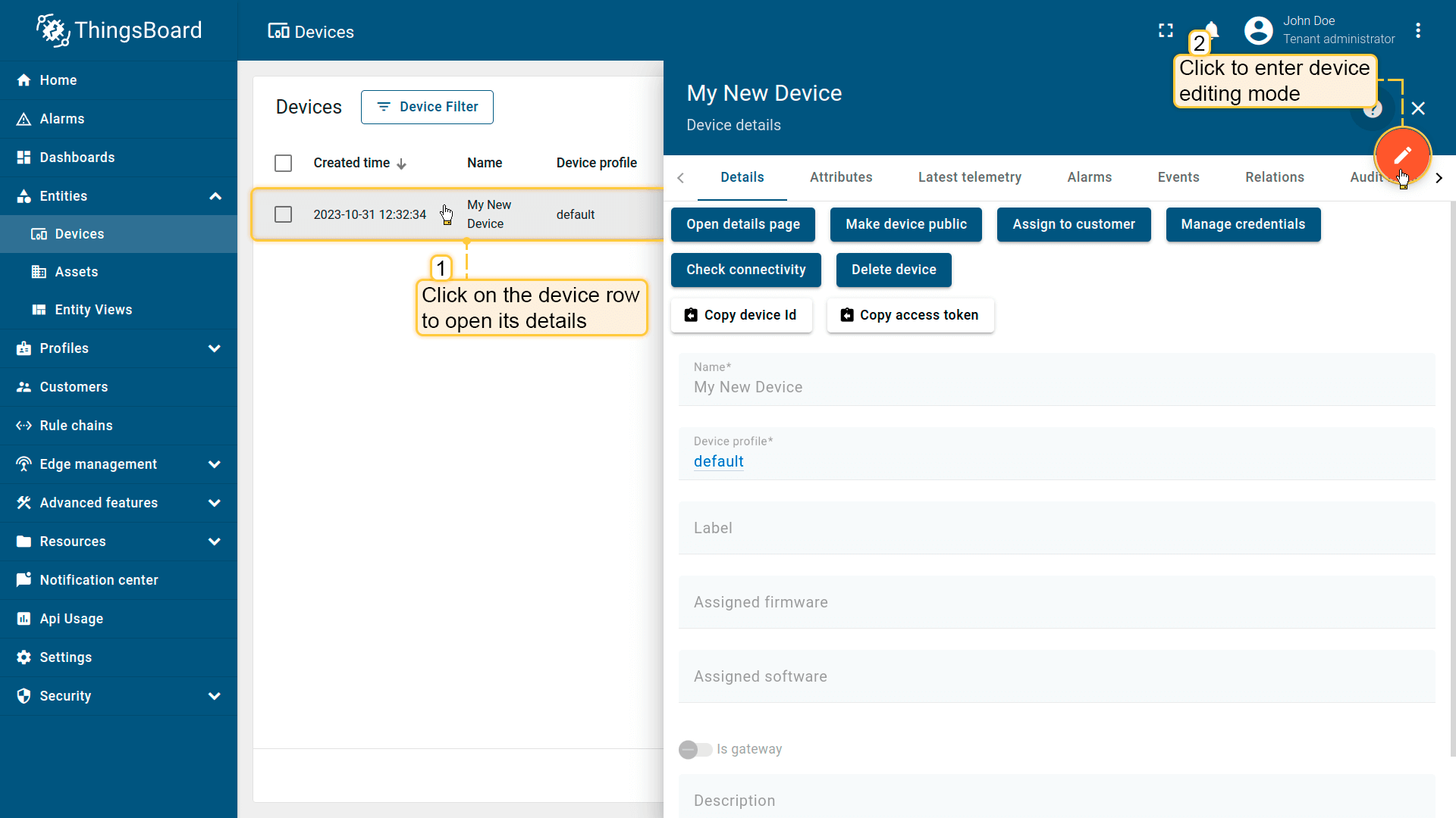 租户管理员及具有相应权限的用户可在ThingsBoard中创建、编辑或删除设备。