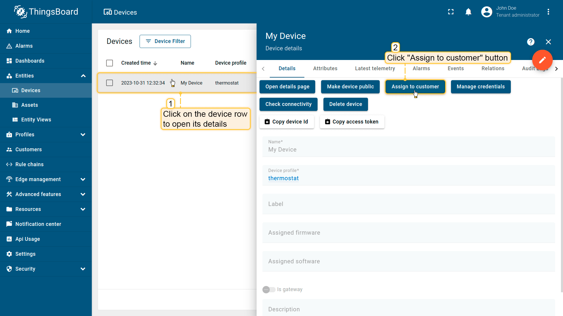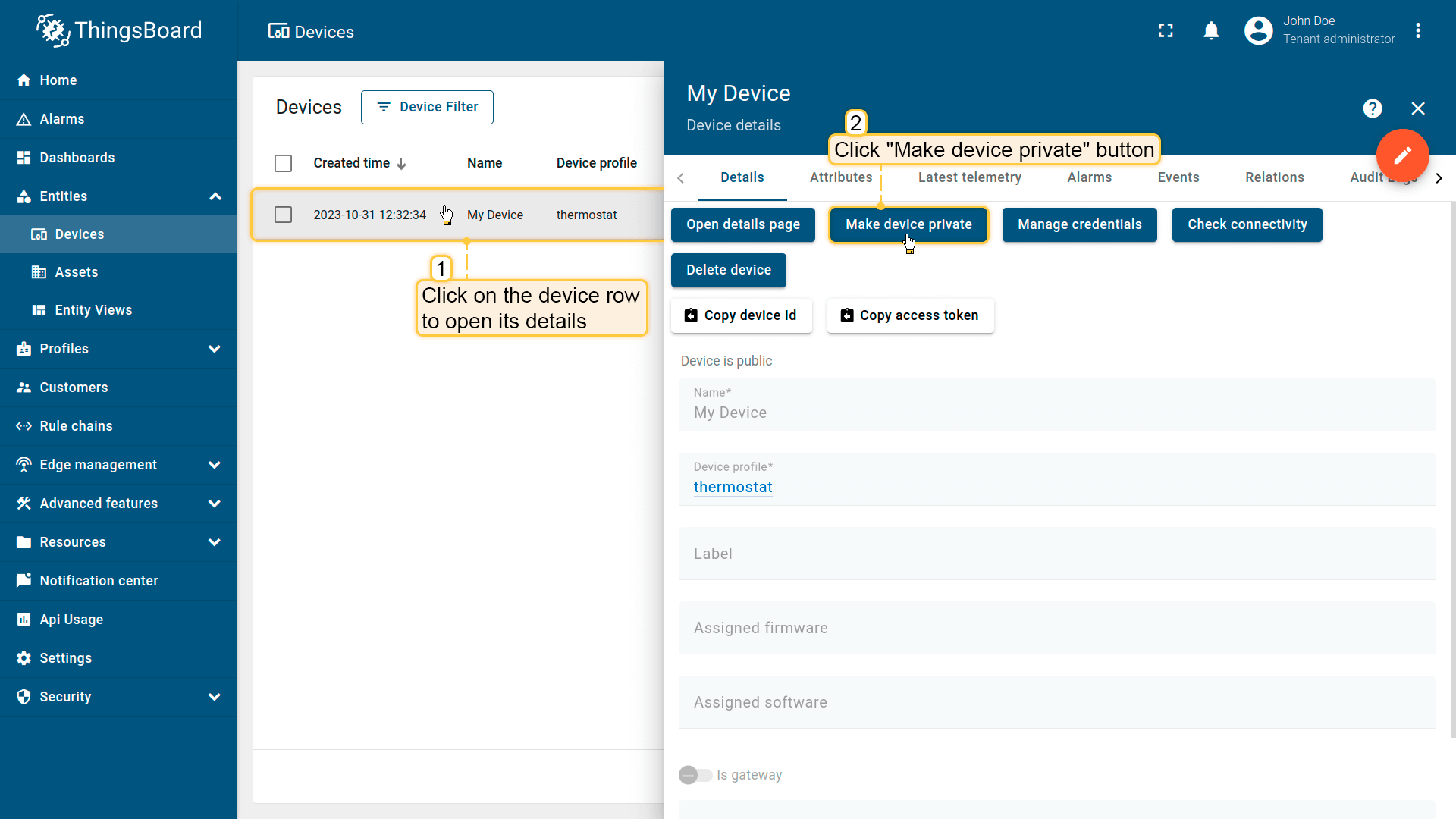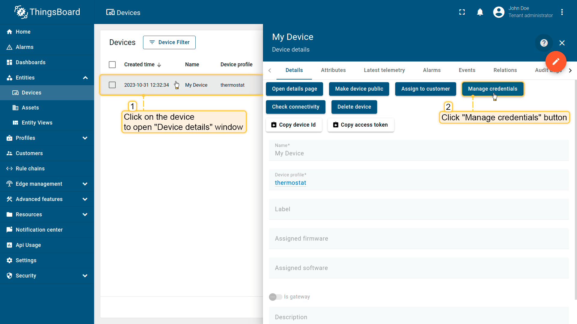 租户管理员及具有相应权限的用户可在ThingsBoard中创建、编辑或删除设备。