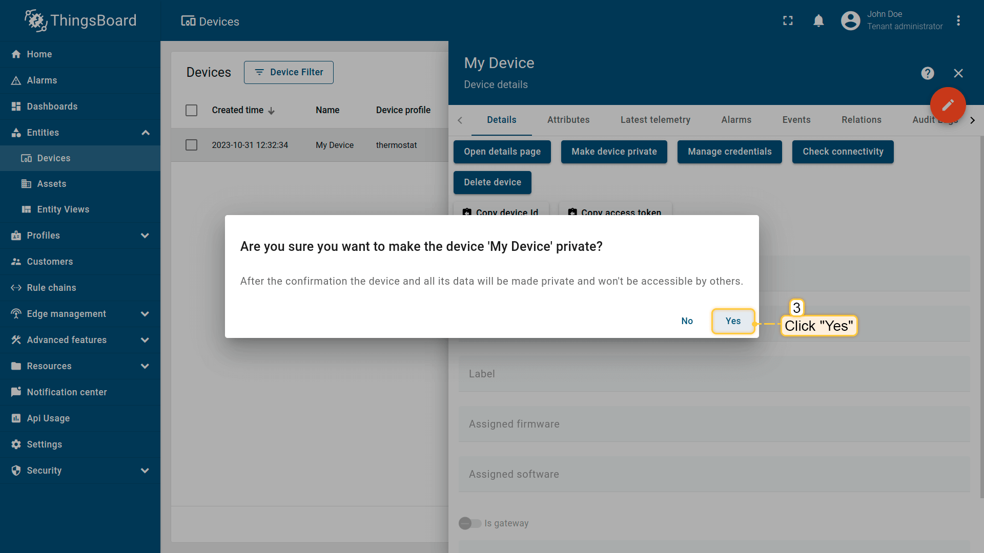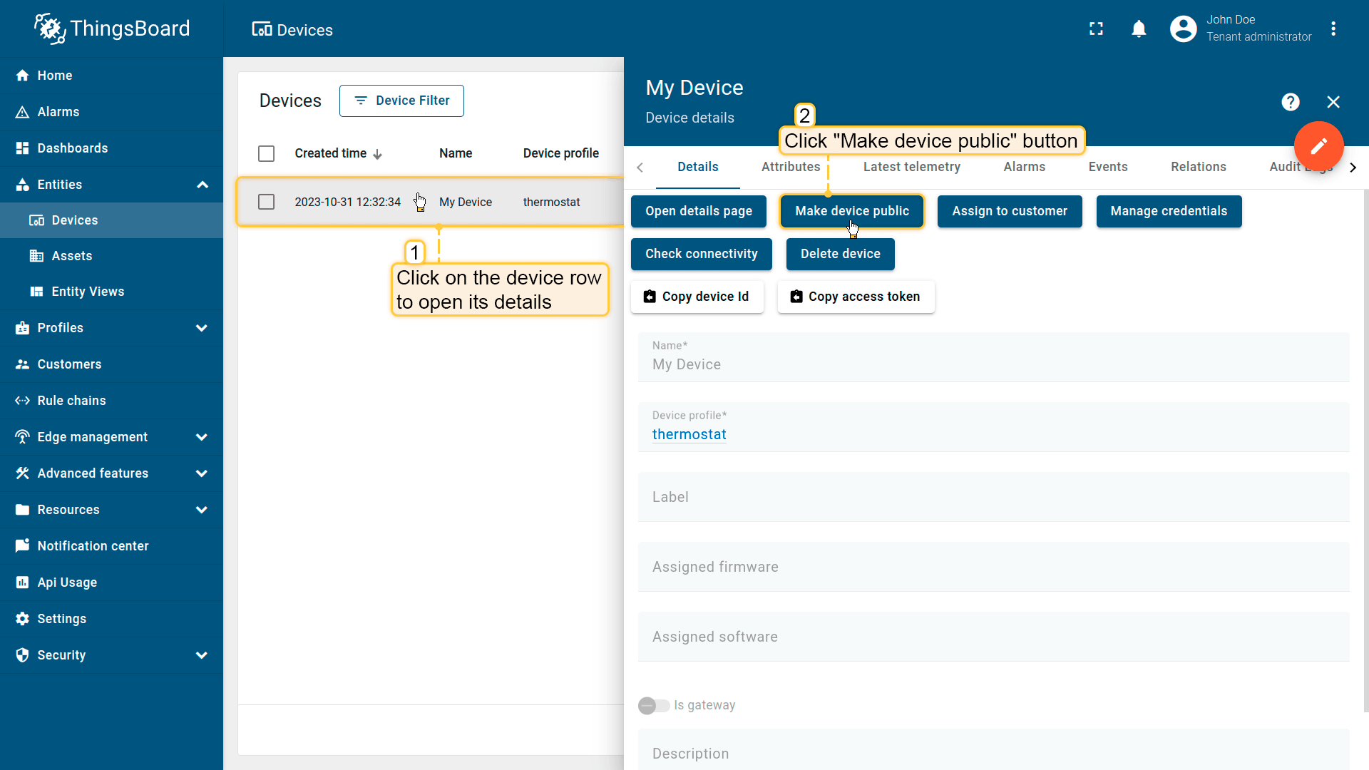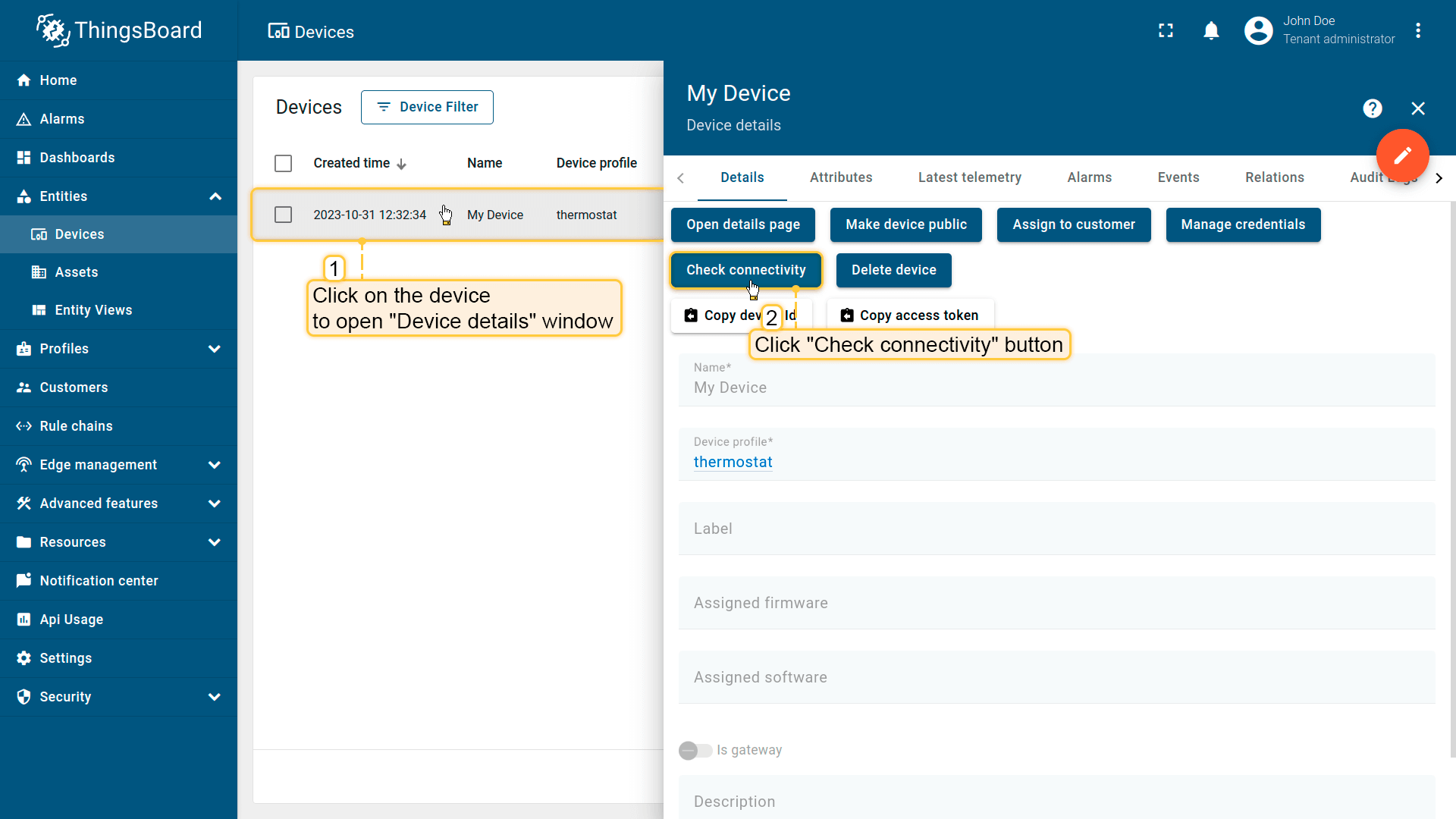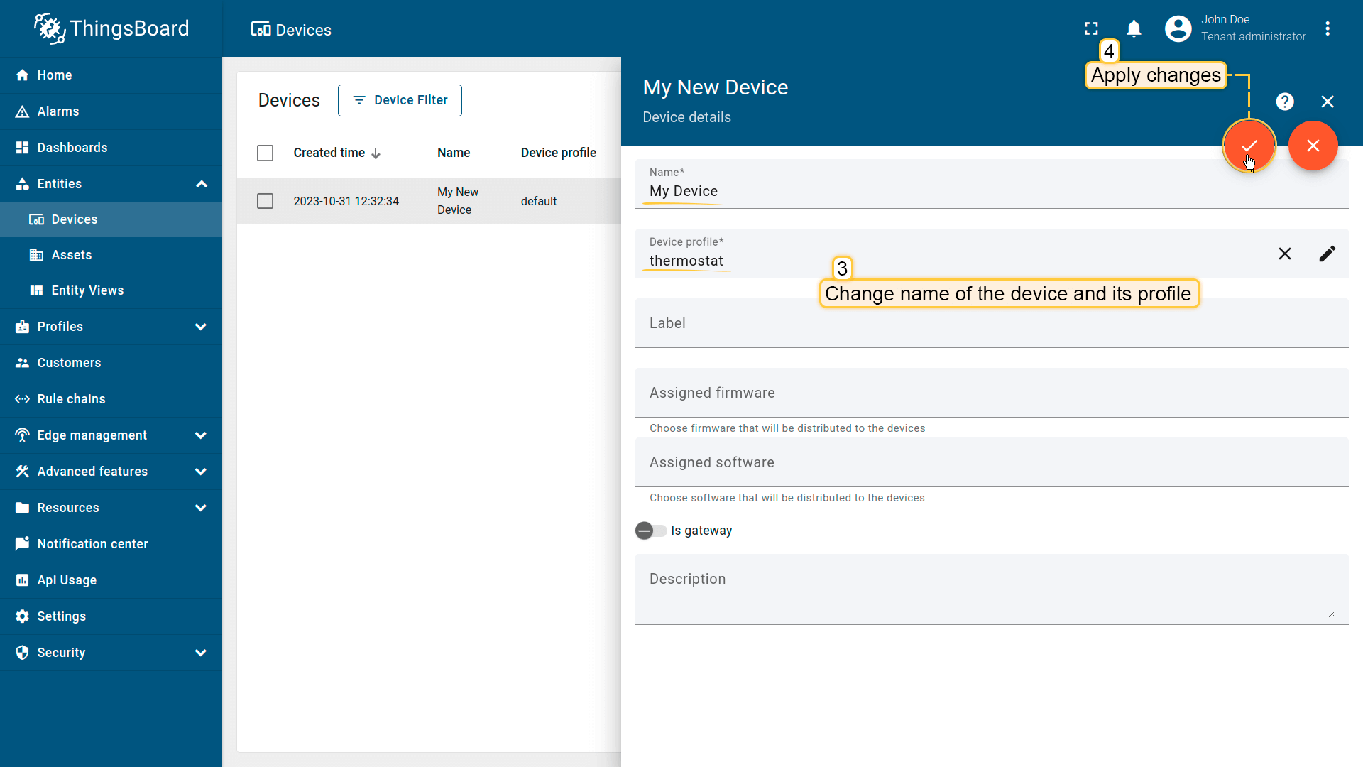 租户管理员及具有相应权限的用户可在ThingsBoard中创建、编辑或删除设备。