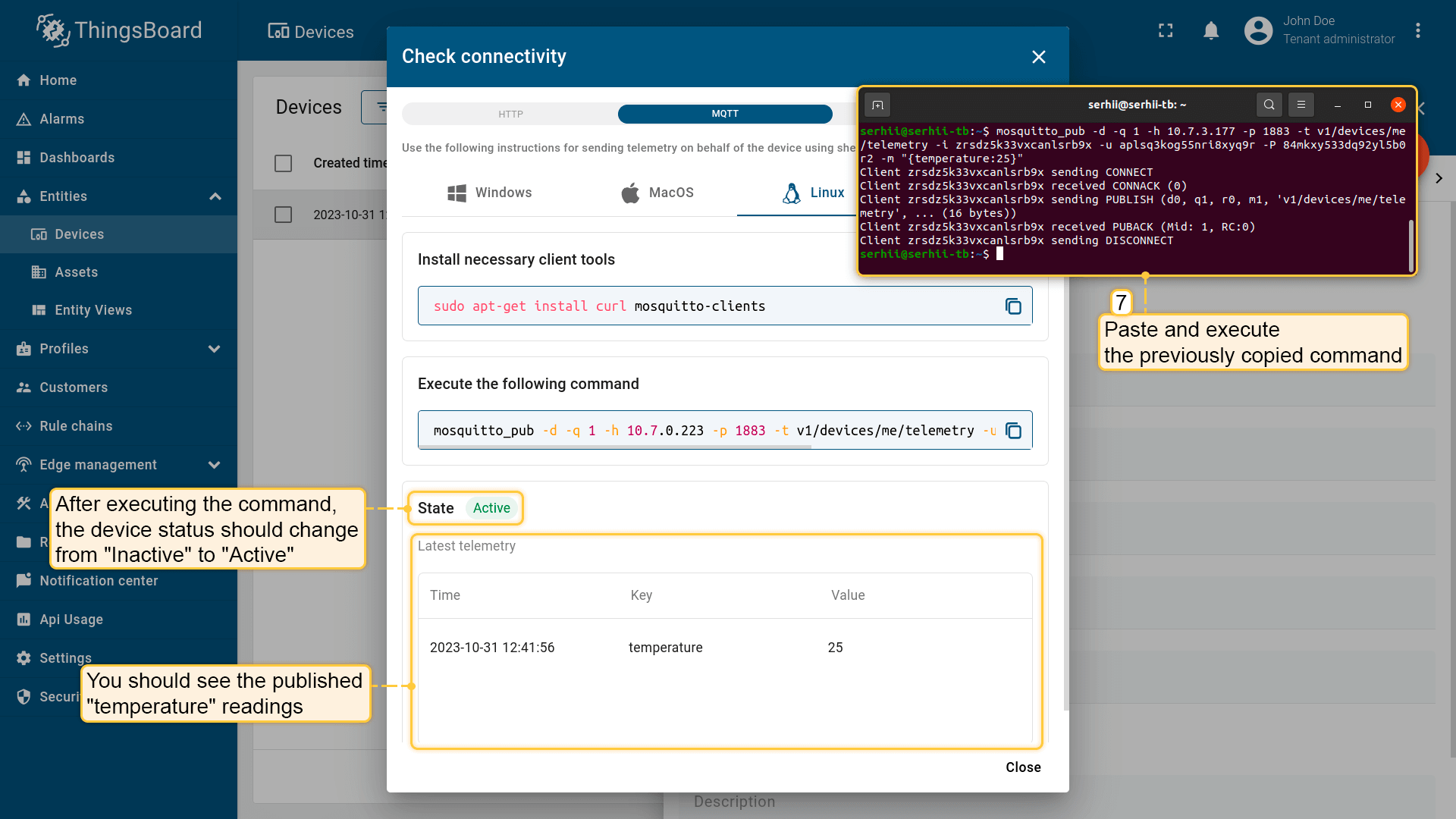 使用此功能可发布测试遥测(例如温度为25),并立即确认设备能与平台通信。