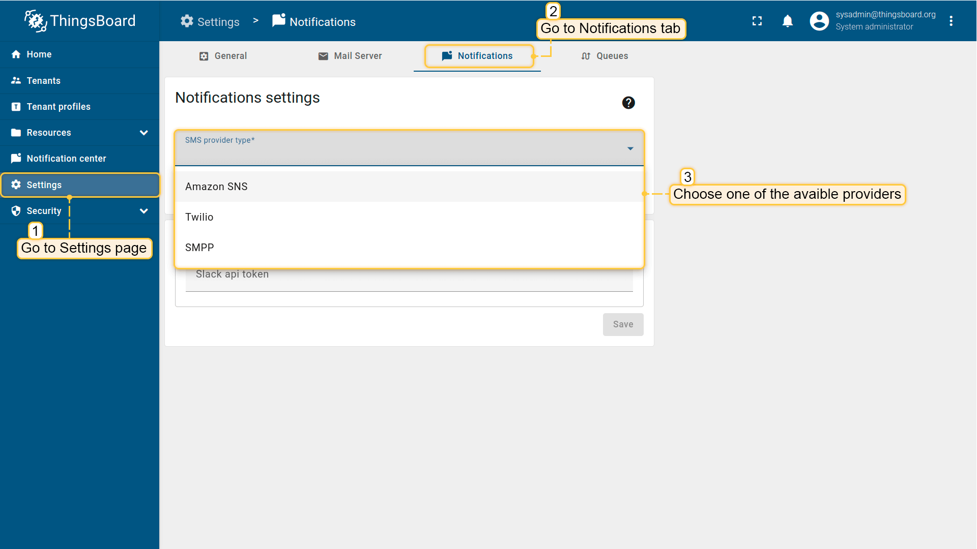 - 登录ThingsBoard UI。进入"设置"页面,然后打开"通知"选项卡。在此窗口中,选择可用的提供商:AWS SNS、Twilio或SMPP。