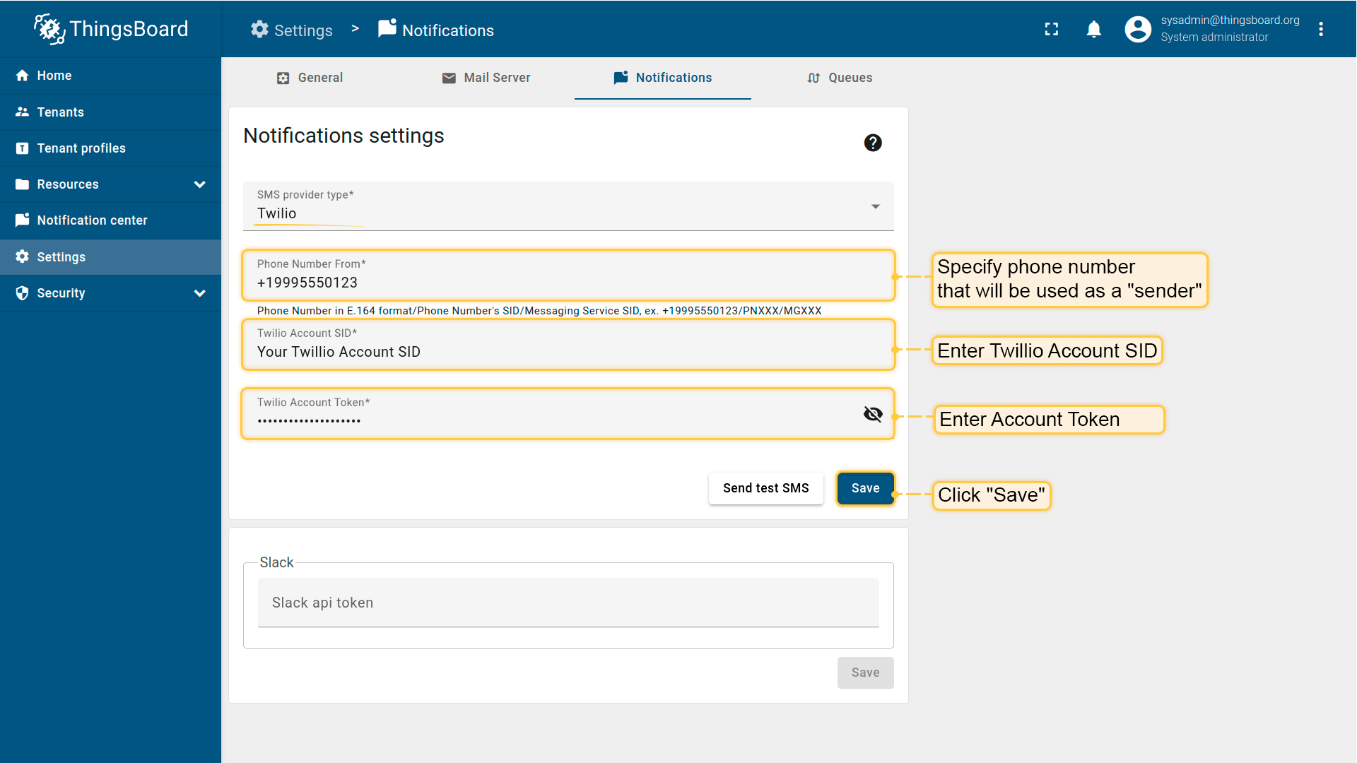 在ThingsBoard中配置SMS提供商,请按下列步骤操作: