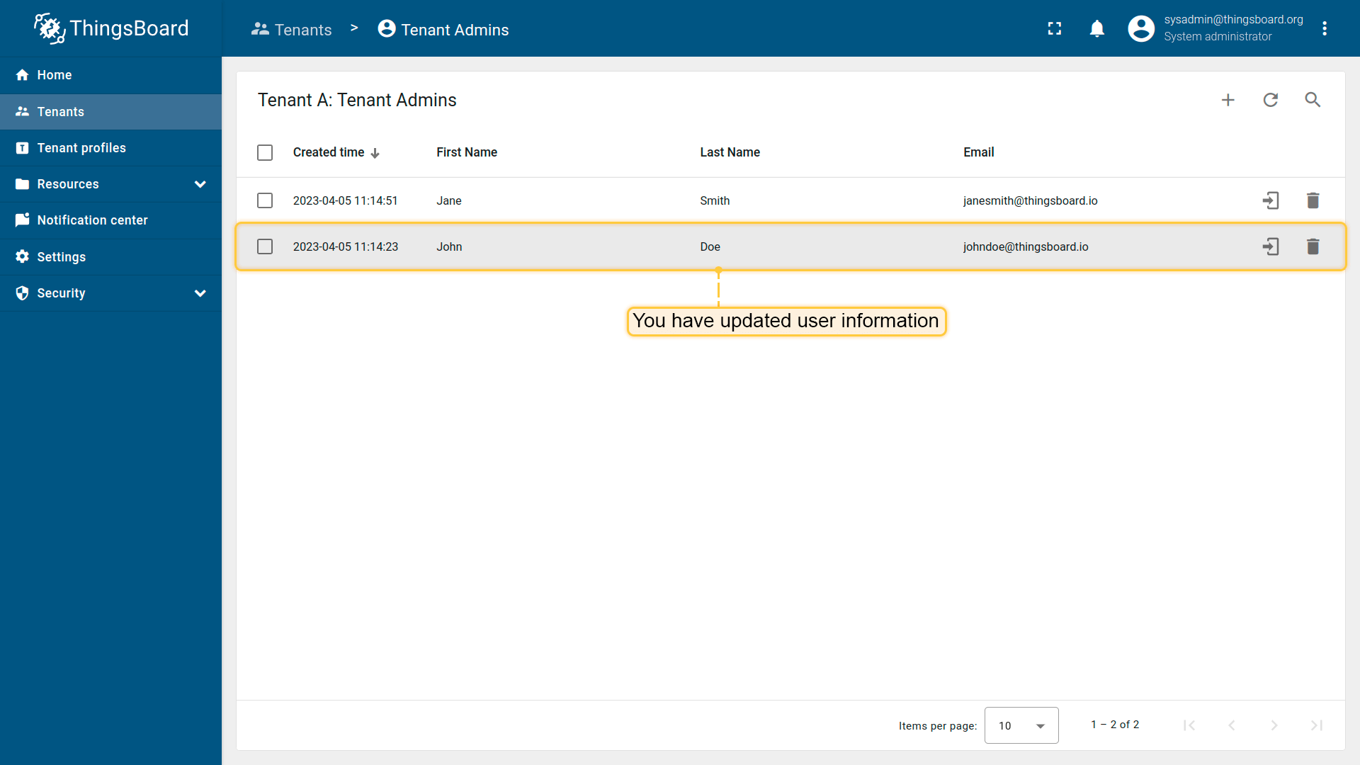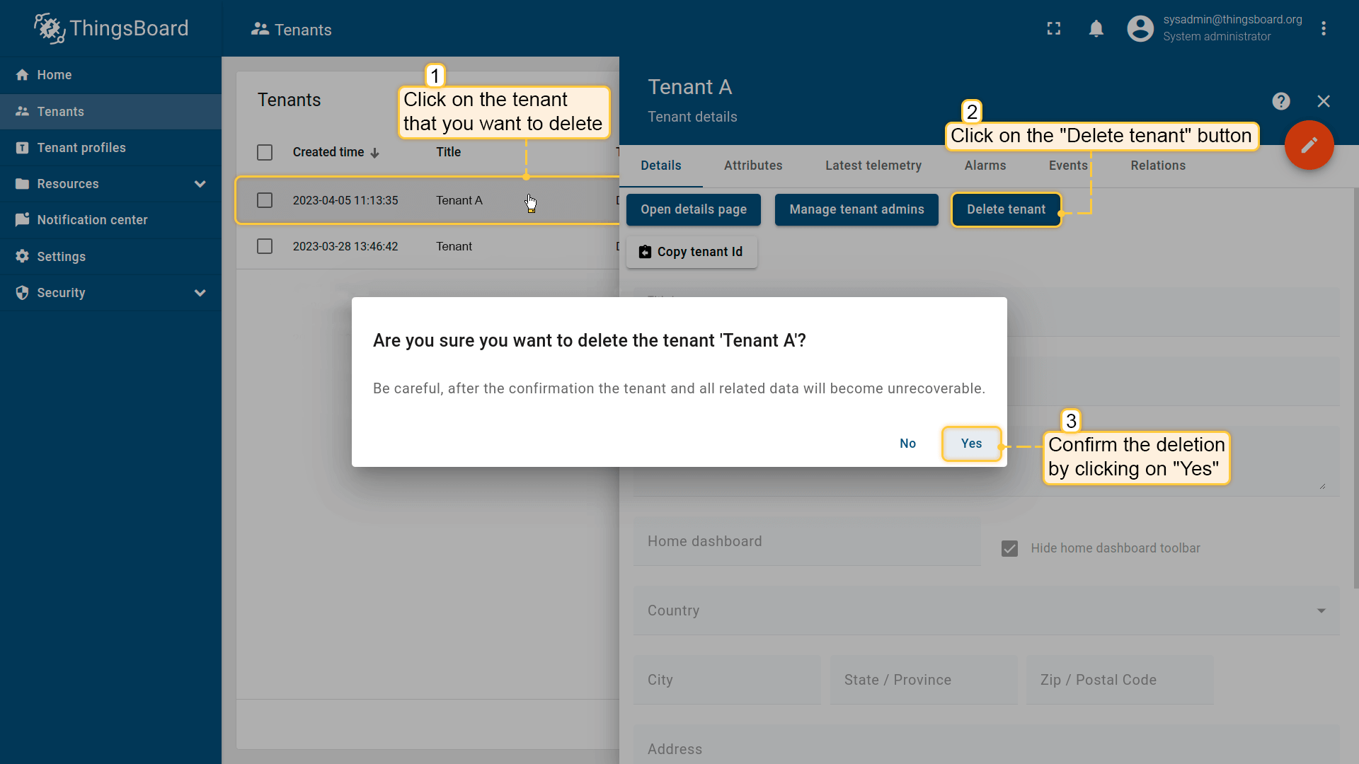 您可以一次性删除租户及其所有用户。为此,请点击“垃圾桶”图标,然后在确认对话框中点击“Yes”。