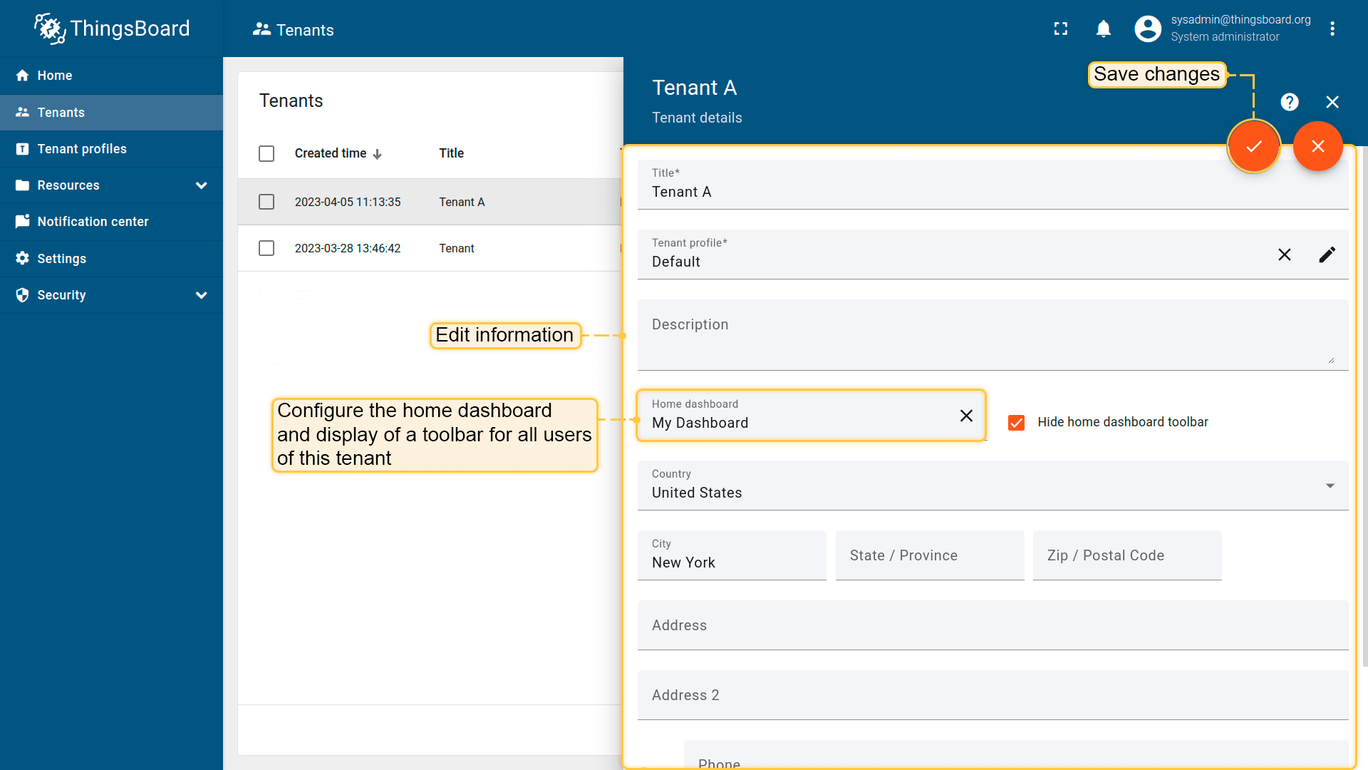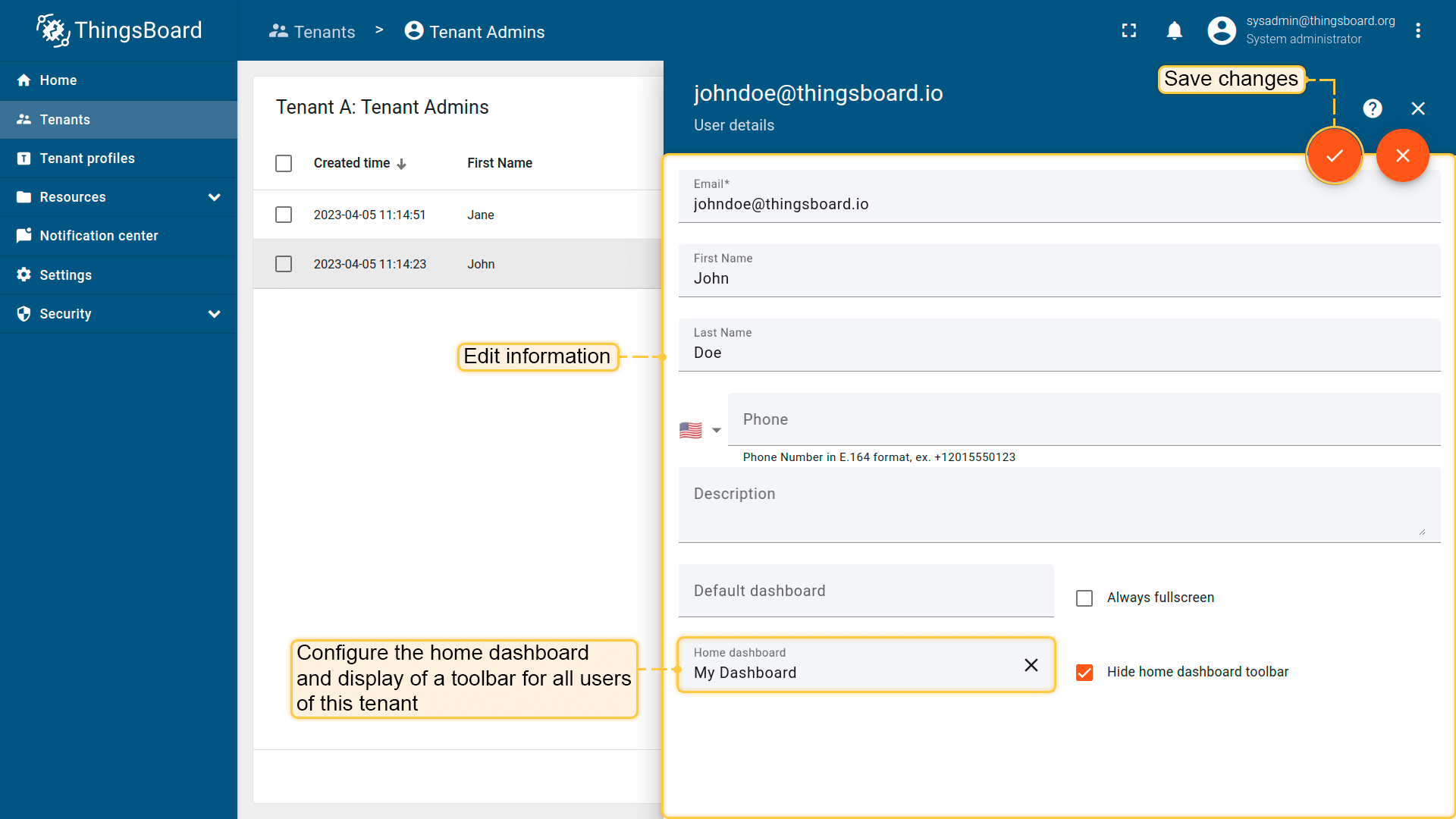 - 编辑相关字段。例如,您可以为该租户下所有用户设置主页仪表板。完成后保存所有更改。