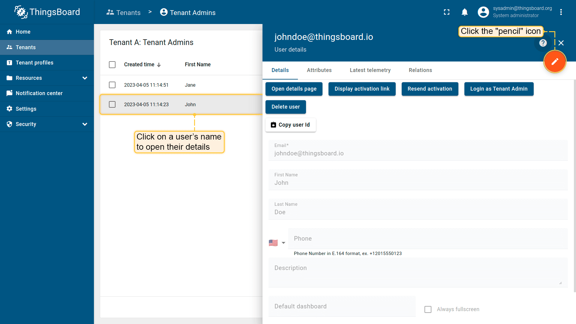 - 点击租户名称以打开其详细信息。点击"铅笔"图标以进入编辑模式。