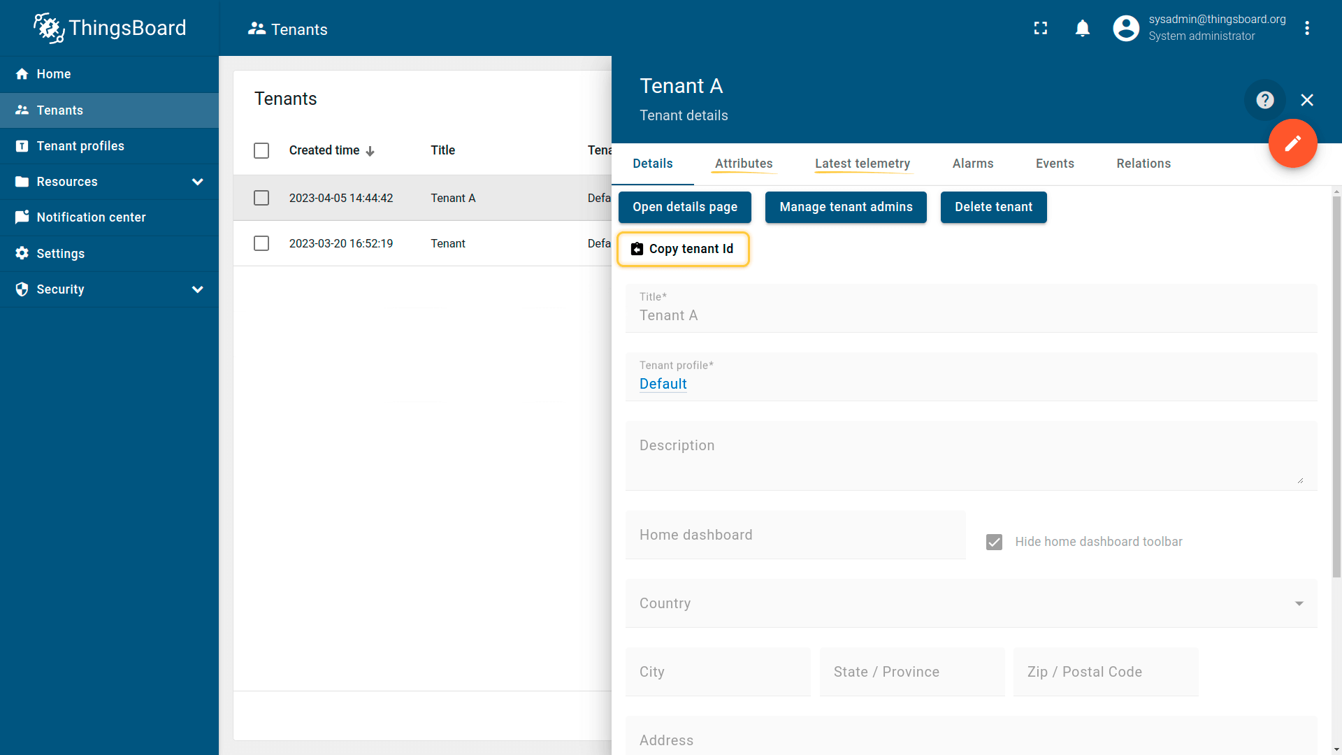 在租户详情页,作为系统管理员,您可以查看属性、最新遥测数据、分配首页仪表板以及复制租户ID。
