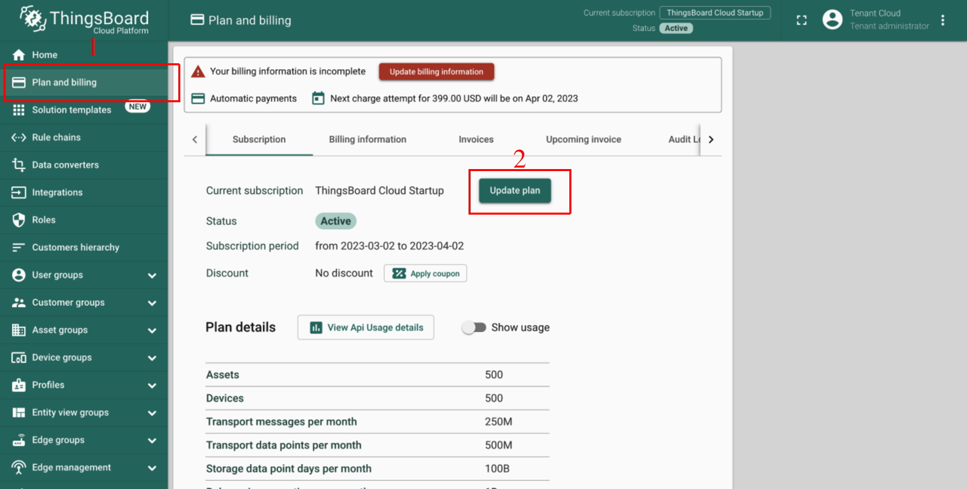 Log in to ThingsBaord Cloud account and select “Plan and Billing” menu option. Press “Update Plan” button